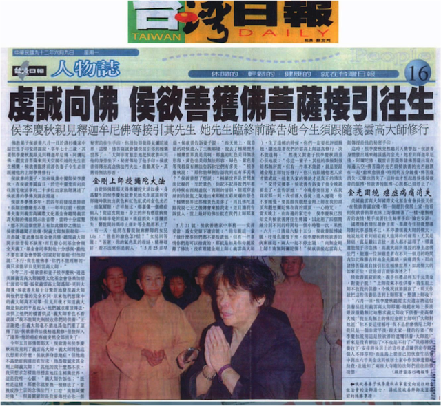 佛教弟子侯欲善六月一日於洛杉磯家中結往生手印安詳圓寂,享年七十三歲,其妻侯李慶秋親眼見到釋迦牟尼佛、阿彌陀佛、觀世音菩薩來到天空接引她的先生往生極樂。侯欲善臨終前諄告妻子今生必須跟隨他的上師學佛修行。